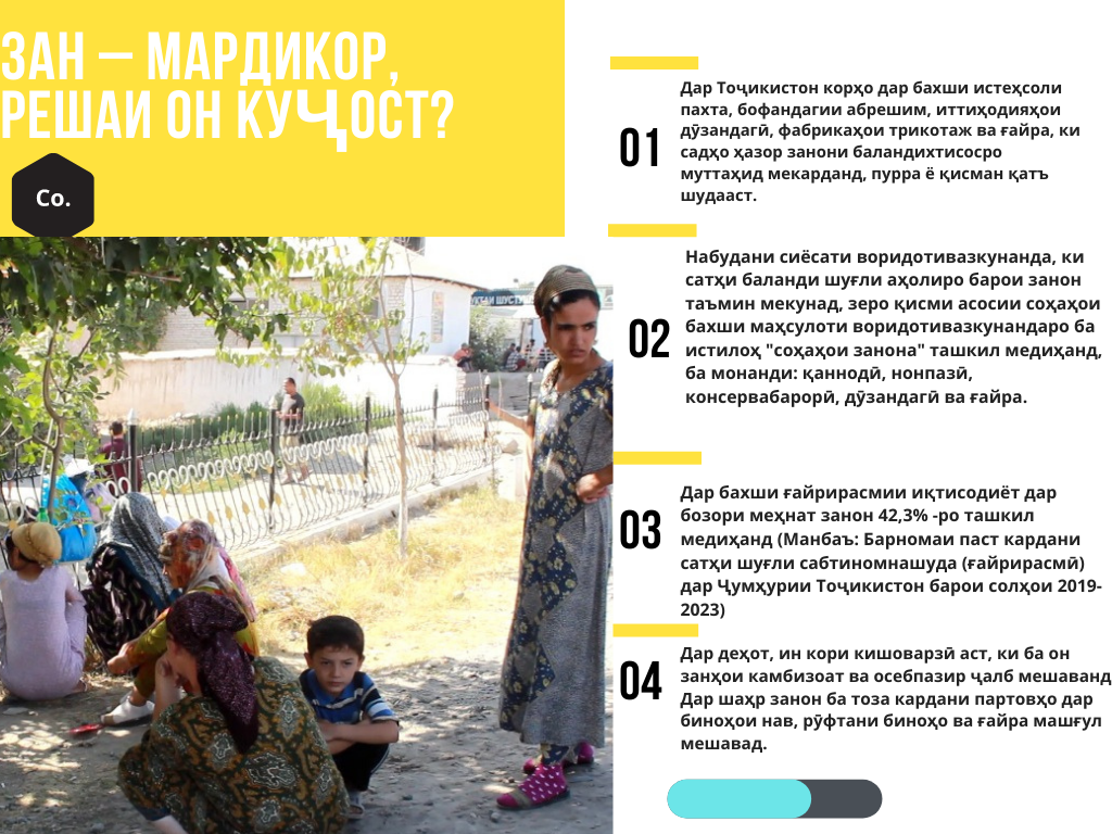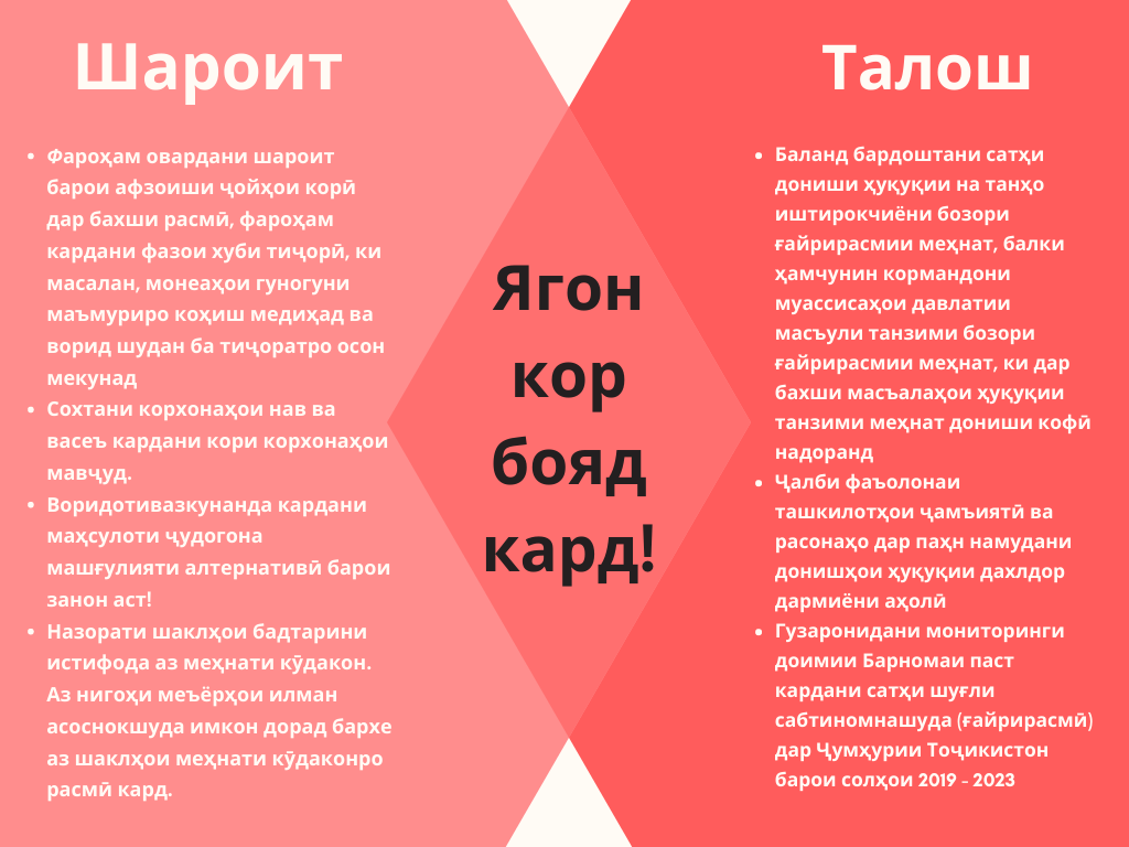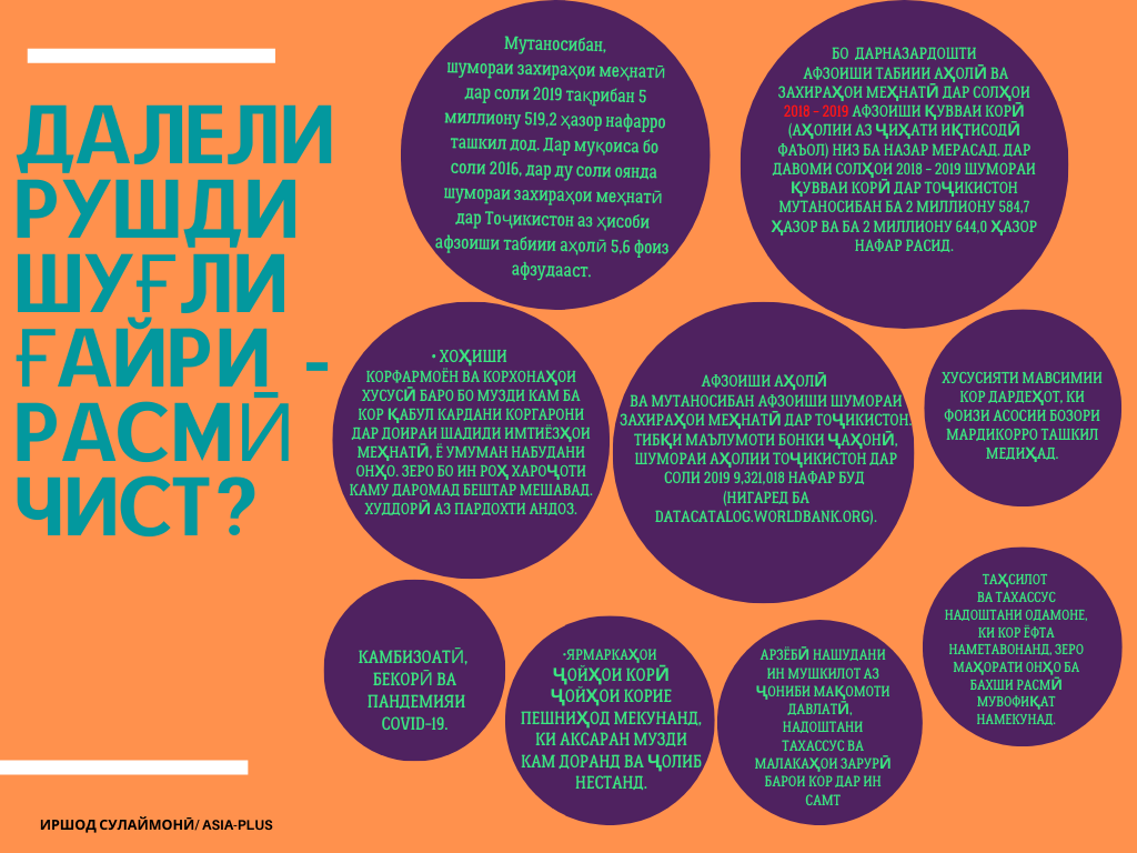 Дар ҷадвалҳои зер ба таври мухтасар баъзе аз омилҳои асосии бозори ғайрирасмии кор дар Тоҷикистон гирдоварӣ шудаастт.