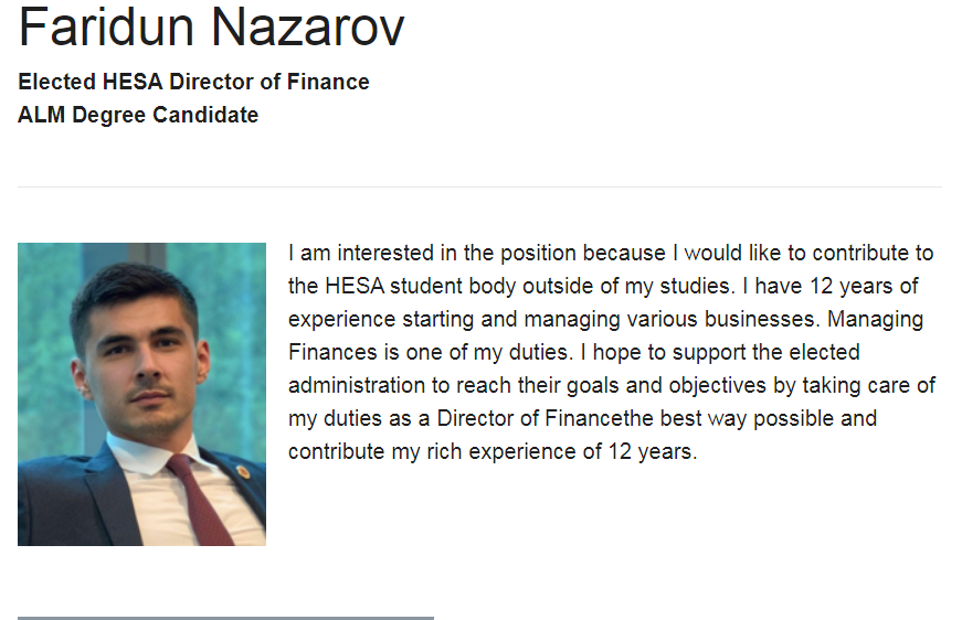 Ҳамчунин, сомонаи “hesaelections.extension.harvard.edu”зимни муаррифии Фариддун Назаров аз забони худаш навиштааст, ки бо таъин шудан ба ин мақом мехоҳад дар ҳайати донишҷӯёни Анҷумани донишҷӯёну хатмкардаҳои донишгоҳи Ҳарвард (HESA) саҳм гузорад.