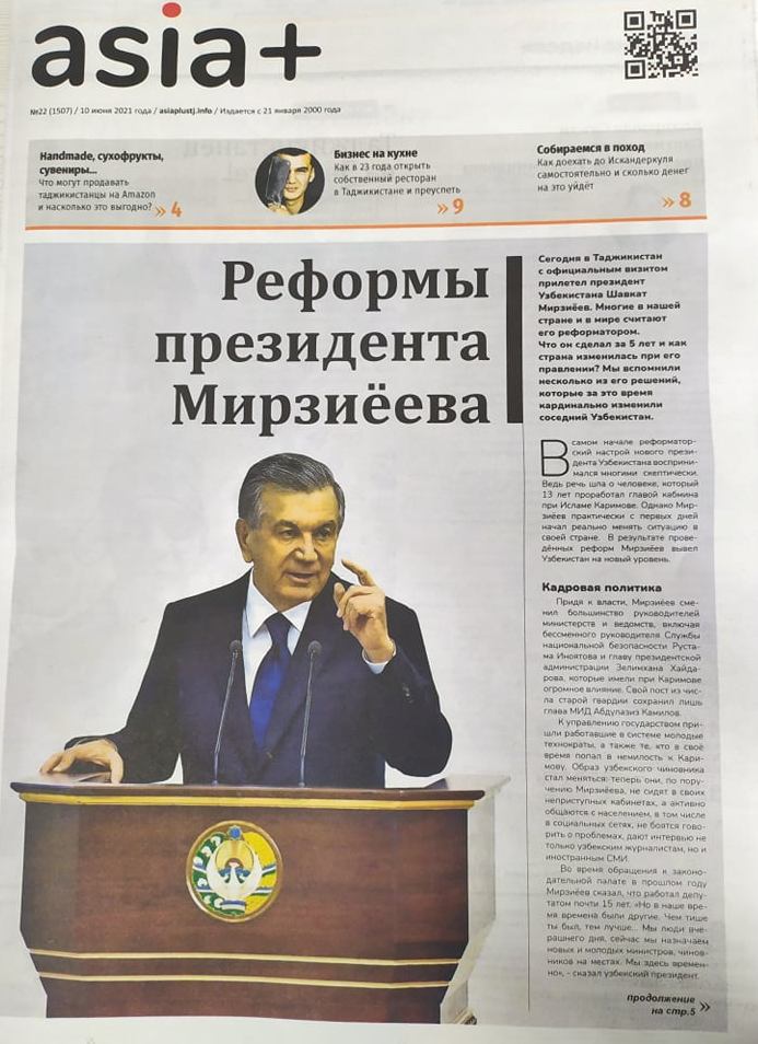 “Реформы президента Мизиёева” сармақолаи ҳафтаномаи “Азия-плюс” (№22 (1507) 10 июни соли 2021) аст, ки дар шумораи рӯзи панҷшанбе нашр шудааст. Дар мақола, ислоҳоти 5 соли охир дар Ӯзбекистон, ки Шавкат Мирзиёев баъди ба қудрат расиданаш роҳандозӣ кардааст, арзёбӣ мешавад. Аз ҷумла, сиёсати кадрӣ, қонун ё озод кардани иқтисодиёт: ислоҳот дар гумрук ва андоз, хусусигардонии замин, технология нав, ВАО, ҷомеа ва ҳуқуқи инсон, мубориза бо фасод дар макотиби таҳсилоти олӣ, баланд бардоштани маоши муаллимон, ҳимояти президент аз муҳоҷирони меҳнатӣ, манъи меҳнати маҷбурӣ ва имиҷи нав аз ислоҳоте гуфта мешавад, ки ба гуфтаи муаллифи мавод Пайрав Чоршанбиев Мирзиёев дар замони роҳбариаш дар Ӯзбекистон ворид намуд.