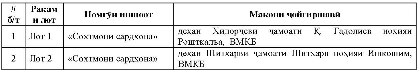 Ташкилоти ҷамъиятии Барномаи Ҷонибдории Инкишофи Иҷтимоии Манотиқи Кӯҳистон (БҶИИМК) -и лоиҳаи Фонди Тоҷикистонии Оғохон дар доираи амалисозии лоиҳаи “Шукуфои Тоҷикистон: Шарикӣ барои рушди иҷтимоию иқтисодӣ”, ҳамаи ташкилотҳо ва шахсони ҳуқуқиро барои иштирок дар тендер барои иҷрои корҳои сохтмонии зерин даъват менамояд:
