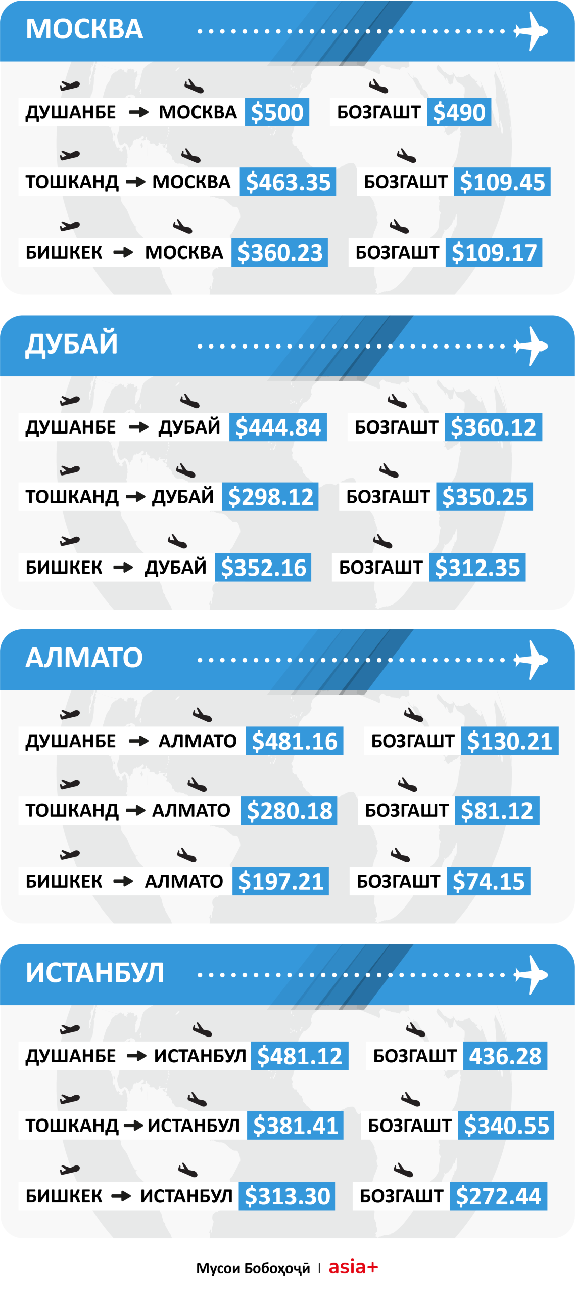 Ёдрас мекунем, ки тибқи маълумоти Агентии авиатсияи гражданӣ, билет ба хатсайрҳои доимӣ аз Душанбе ба Маскав 350 доллар ва аз Маскав ба Душанбе бо ин хатсайрҳо – 150 доллар нарх дорад.
