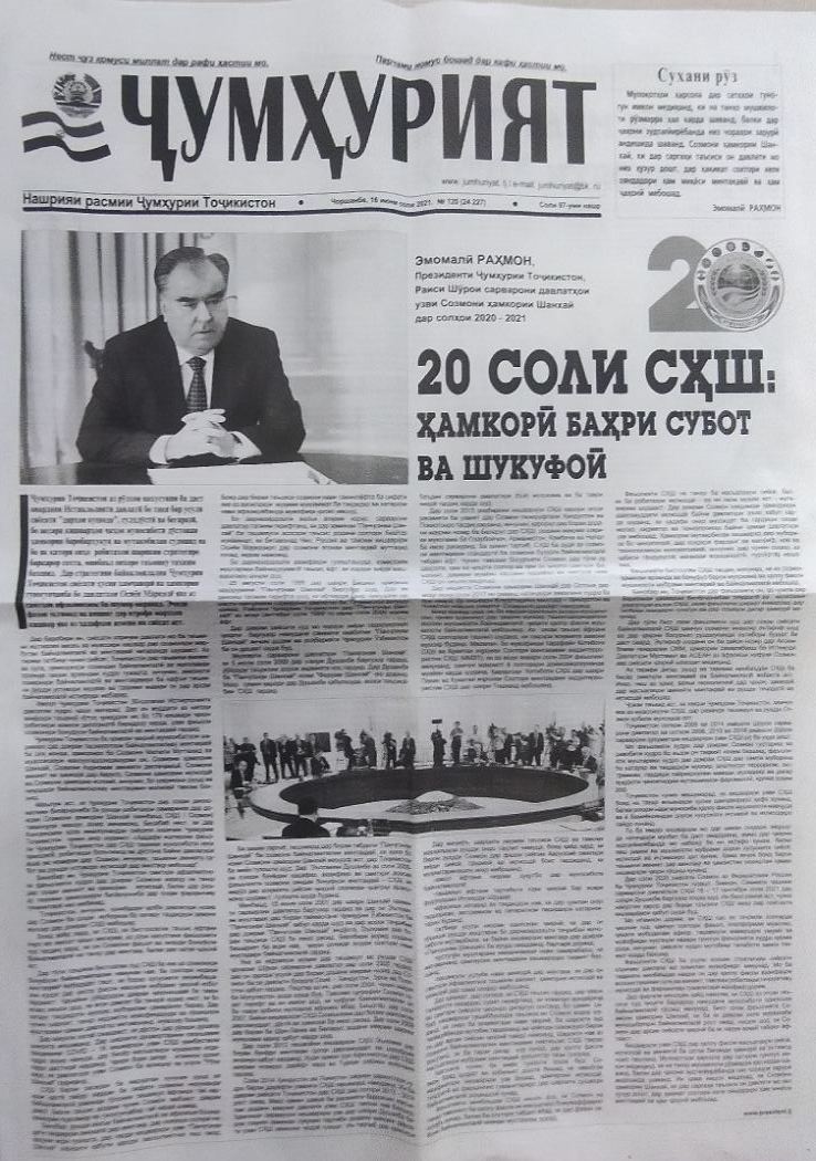 Рӯзномаи “Ҷумҳурият” – нашрияи расмии Ҳукумати Тоҷикистон дар шумораи навбатии худ (16.06.2021) мақолаи Президенти Ҷумҳурии Тоҷикистон Эмомалӣ Раҳмон дар мавриди Созмони Ҳамкории Шанхай ва ҳамчунин мусоҳибаи ӯ ба муносибати 20 солагии таъсисёбии СҲШ-ро нашр намудааст.