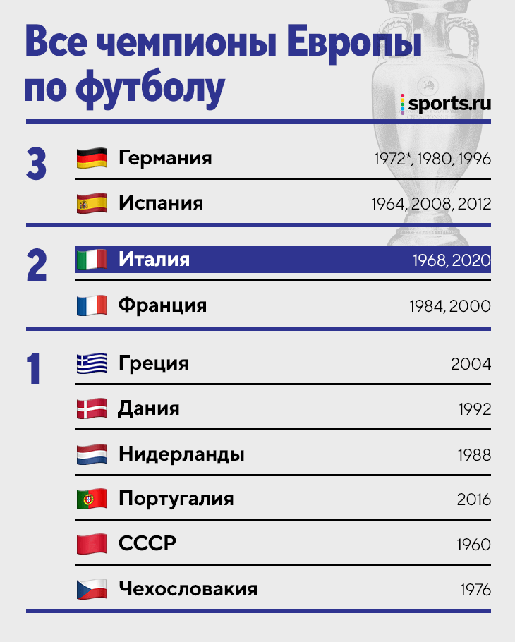 Итолиёвиҳо бори аввал соли 1968 ин ҷомро ба даст оварда буданд. Пас аз он, онҳо дар финал боз ду маротиба бозӣ карданд, аммо аз фаронсавиҳо (2000) ва испаниҳо (2012) мағлуб шуданд.