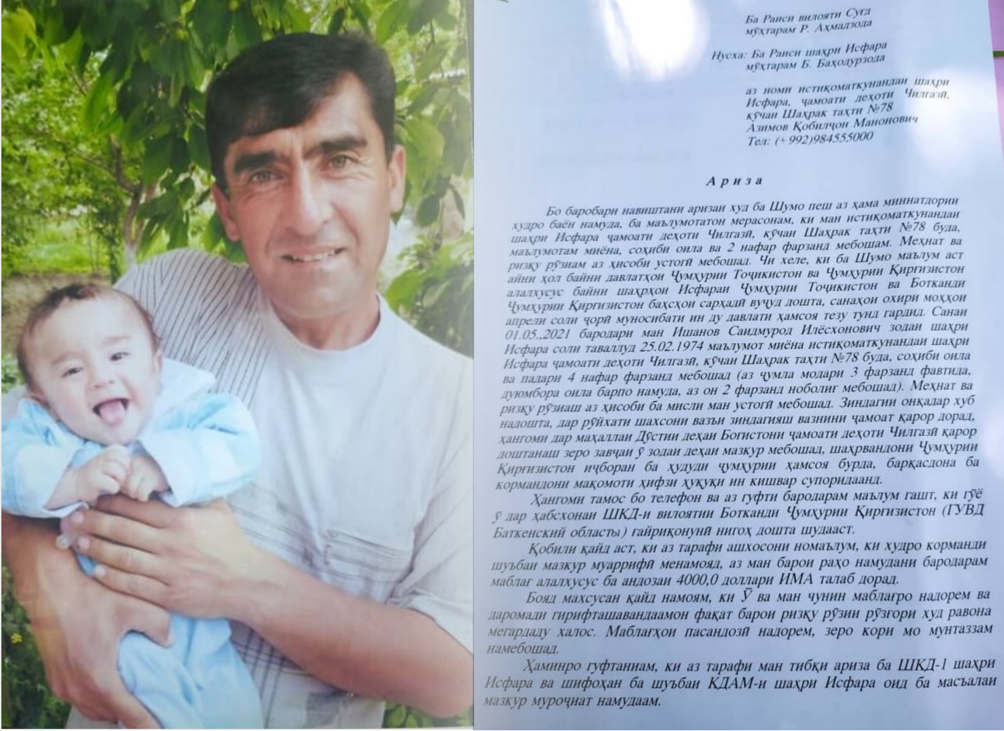 Ин сокини шаҳри Исфара рӯзи 1-уми май дар марзи деҳаи Боғистони ҷамоати Чилгазӣ бо деҳаи Равоти вилояти Бодканд боздошт шуда буд. Он вақт пайвандонаш иддао доштанд ӯро шаҳрвандони мулкии қирғиз ғайриқонунӣ боздошт ва ба мақомоти пулиси Бодканд супурдаанд.