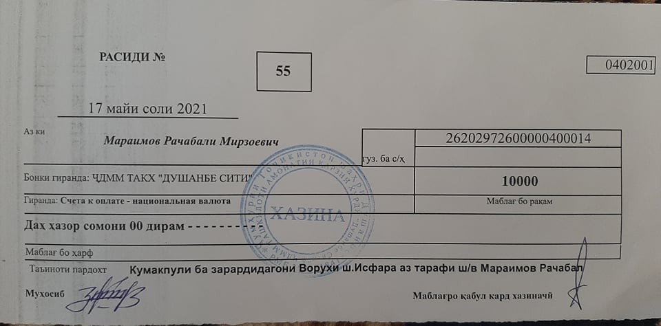 Ба дунболи ин гуфтаи муовини вазир, Раҷаби Мирзо, рӯзноманигор ва масъули гуруҳи фейсбукии "Ахбор барои афкор" расид ё чекеро нашр кард ва гуфт, аз ҳисоби хайрияи мардум ба суратҳисоби бозкардаи Вазорати молия 10 ҳазор сомонӣ гузарондааст. Раҷаби Мирзо пурсид, ки 10 ҳазор сомонӣ куҷо шуд, вақте муовини аввали вазир мегӯяд, ба суратҳисоб маблағ ворид нашудааст.