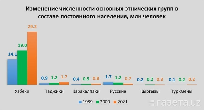 Бар асоси ин омор дар Узбекистон аз ҳама маҷмӯаи бузурги қавмӣ ӯзбекҳо ҳисоб шудаанд, ки шумораашон ба 29 миллион расида ва аз 34,86 миллион 84 дар сади аҳолии ин кишваро дар бар мегиранд. Дар муқоиса бо охирин нуфусшумории Шӯравӣ дар соли 1989 шумораи ӯзбекҳо дар Ӯзбекистон ду баробар зиёд шудааст.