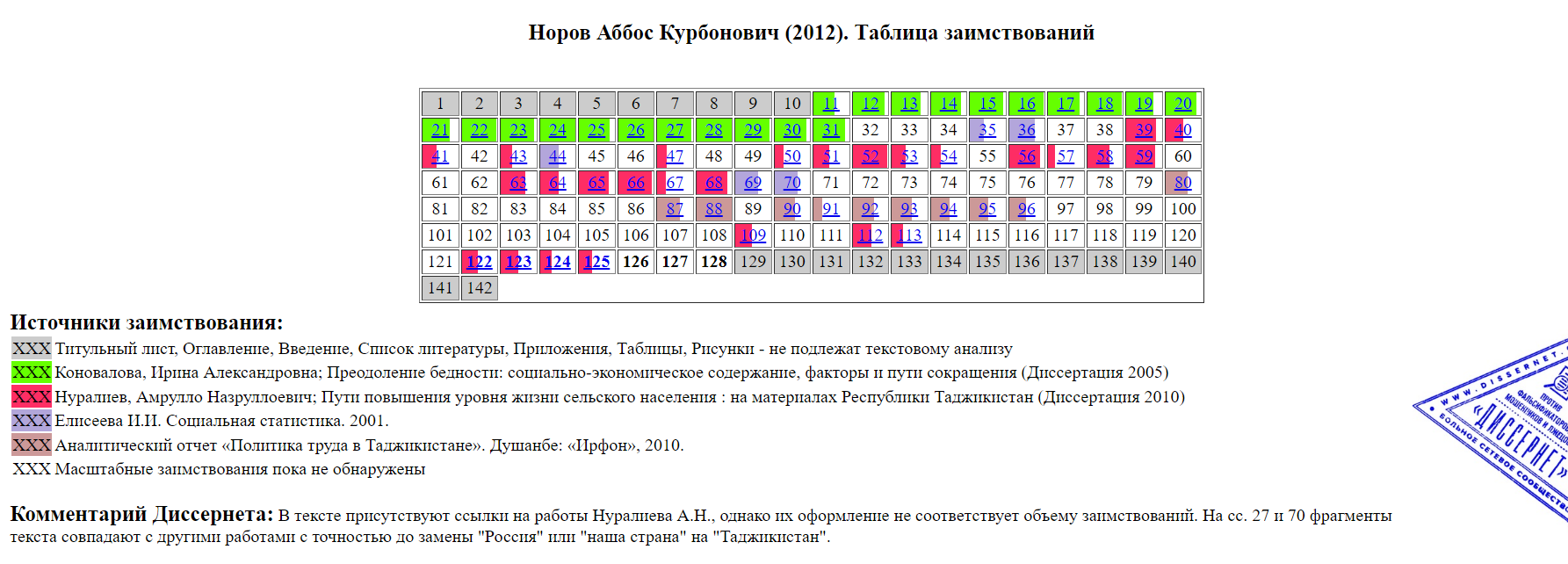Ба навиштаи торномаи ин пойгоҳ, Норов Аббос рисолаи номзадии худро дар мавзӯи “Асосҳои иҷтимоӣ-иқтисодӣ коҳиши сатҳи фақр” (дар асосои маводи Ҷумҳурии Тоҷикистон ) (Социально – экономические основы сокращения уровня бедности) бахши зиёди кори худро аз рисолаи илмии Ирина Коновалова “Преодоление бедности: социально-экономическое содержание, фактори и пути сокращения”, ки соли 2005 дифоъ шудааст, Нуралиев Амрулло “Пути повышения уровня жизни сельского населения: на материалах Республики Таджкистан”, ки соли 2010 дифоъ шудааст ва Елисеева И.И. “Социальная статистика” (2001) рӯйбардор карда, даст ба асардӯздӣ задааст.