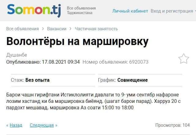Дар эълон гуфта мешавад, ки “барои ҷашн гирифтани Истиқлолияти давлаӣ то 9 сентябр нафароне лозим ҳастанд, ки маршировка биёянд, (шагат барои парад). Ҳар рӯз 20 с пардохт мешавад. Маршировка аз соати 15:00 то 18:00”.