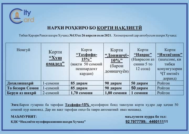 Бо гузашти ду рӯз аз болоравии роҳкиро дар Тоҷикистон идораи “Нақлиёти мусофиркашонии шаҳри Хуҷанд” эълом кард, ки арзиши мусофиркашонӣ дар автобусҳоро боло бурдани нест. Нархи роҳкирои дохилишаҳрӣ дар автобусҳо 1 сомонӣ ва беруназшаҳрӣ 2 сомонӣ бетағйир боқӣ монд.
