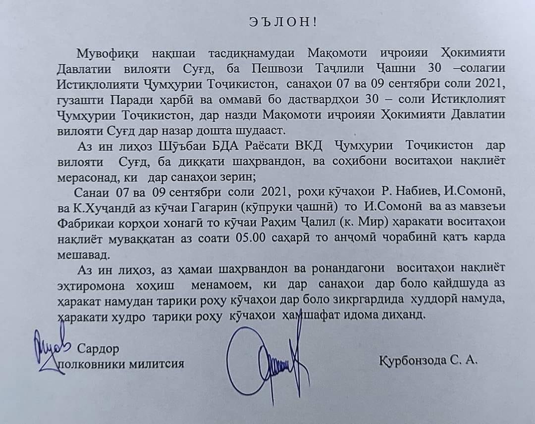 Ин ниҳод гуфтааст рӯзҳои 7 ва 9-уми сентябр роҳи кӯчаҳои Раҳмон Набиев, Исмоили Сомонӣ ва Камоли Хуҷандӣ аз кӯчаи Гагарин (назди пули ҷашнӣ) то Исмоили Сомонӣ ва аз мавзеи Фабрикаи корҳои хонагӣ то кӯчаи Раҳим Ҷалил ҳаракати воситаҳои нақлиёт аз субҳи соати 05:00 то анҷоми чорабинӣ муваққатан манъ мегардад.