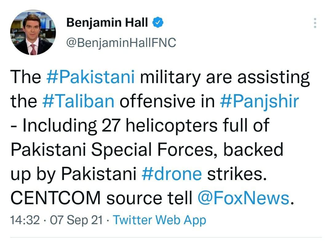 Бенҷамин Ҳол, хабарнигори шабакаи телевизионии Фокснюз (Fox News)-и Амрико бо нақл аз як манбаъе аз Ситоди фармондеҳии марказии артиши Амрико дар саҳфаи Твиттараш, ки артиши Покистон бо ҳамлаҳои паҳподӣ (ҳавопаймоҳои бесарнишин) ва 27 чархболе, ки дар дохилашон нерӯҳои вижаи ин кишвар буданд, ба Толибон дар Ҷабҳаи Панҷшер кӯмак мекунад.