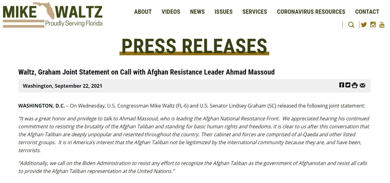 "Гуфтугӯ бо Аҳмад Масъуд, раҳбари Фронти миллии муқовимат дар Афғонистон ифтихори бузург буд. Аз суҳбат бо Аҳмад Масъуд хурсанд шудем, ки ӯ ба муқовимат бо бераҳмии Толибон ва ҳифзи ҳуқуқу озодиҳои заминавии инсон содиқ мемонад", – гуфта мешавад дар изҳороти конгрессмен.