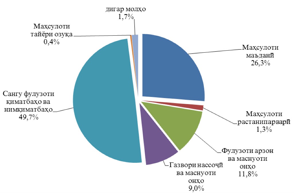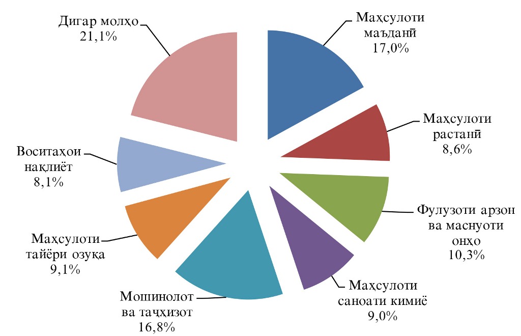 Ёдрас мекунем, ки аз рӯйи натиҷаҳои соли 2019 ҳаҷми содироти молу маҳсулот аз ҷумҳурӣ 1,1 млрд доллар ва воридоти он ба кишвар – 3,3 млрд долларро ташкил дода буд.