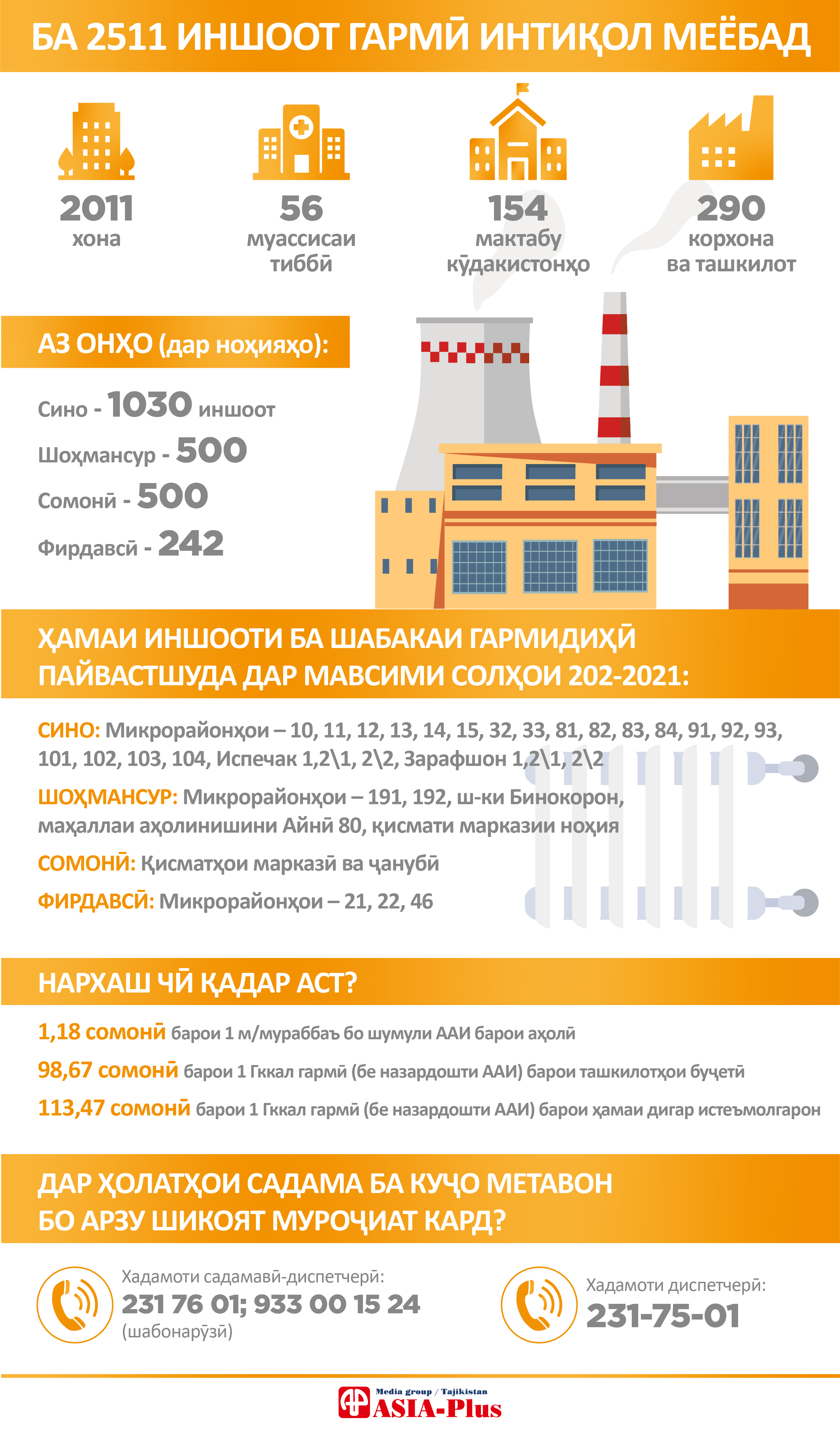 Тавре ба “Азия-Плюс” аз Муассисаи давлатии “Шабакаҳои гармидиҳии Душанбе” хабар доданд, дар мавсими соли 2021-2022 дар пойтахти Тоҷикистон бо гармӣ таъмин намудани 2 762 (мавсими соли гузашта – 2511 иншоот) иншоот ба нақша гирифта шудааст, ки 251 иншоот зиёдтар нисбат ба мавсими соли гузашта аст.