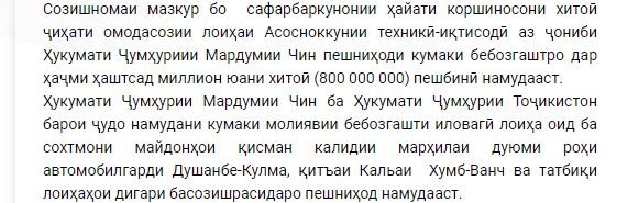 “Бо дархости Ҳукумати Ҷумҳурии Тоҷикистон, Ҳукумати Ҷумҳурии Мардумии Чин ба Ҳукумати Ҷумҳурии Тоҷикистон кумаки бебозгаштро дар ҳаҷми 800 млн юани чинӣ барои пуркунии воситаҳои нокофии лоиҳа оид ба сохтмони майдонҳои қисмати калидии марҳилаи дуюми роҳи автомобилгарди Душанбе – Кулма ва татбиқи лоиҳаҳои дигари басозишрасида пешниҳод менамояд”, – омадааст дар матни санад.