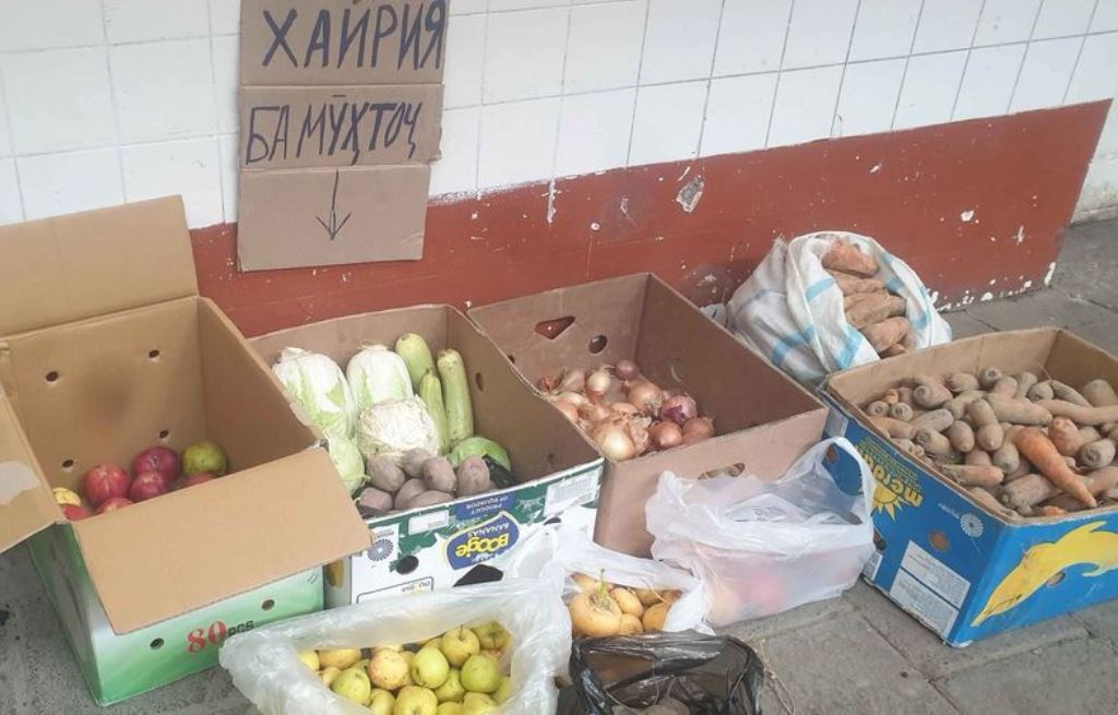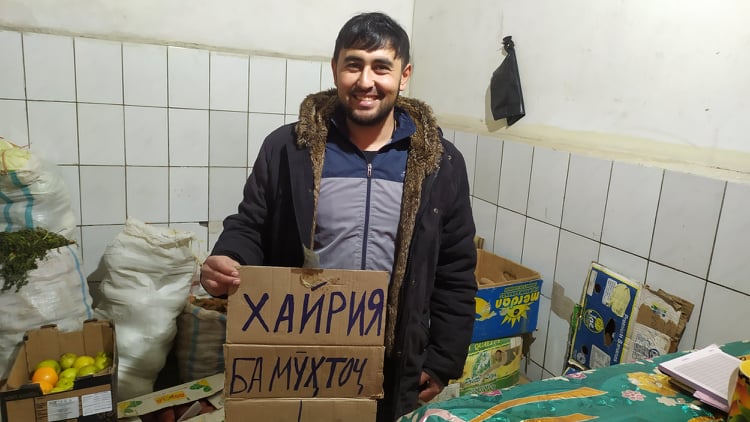 Ин гӯшаи хайриявиро Бахтиёр Нуриддинов як тоҷири навкори 30-сола дар назди дӯконаш ташкил кард ва ҳамарӯза қисме аз меваҷоту сабзавотро ба эҳтиёҷмандон хайр мекунад.