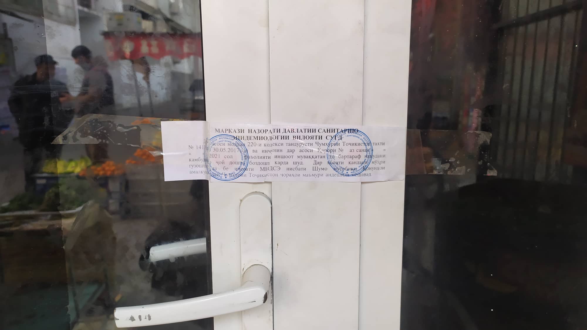 Ба дари дӯкони фурӯши гӯшти мурғ (грилл) дар даромадгоҳи бозори “Афғонбозор” аз суйи Маркази назорати давлатии санитарию эпидемиологии вилояти Суғд мӯҳр зада шудааст.