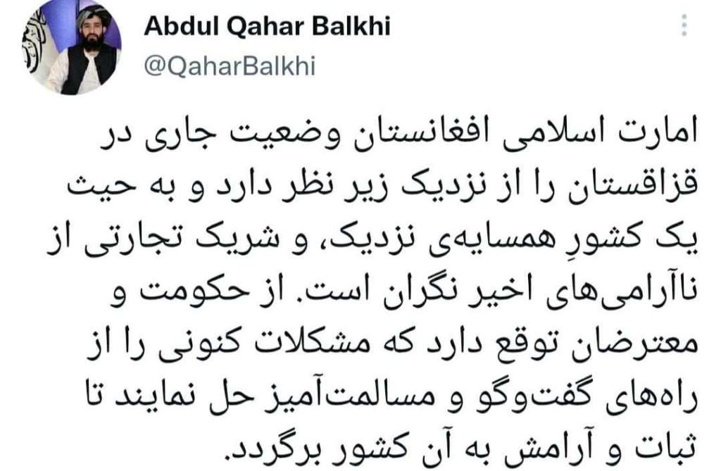 Ҳукумати сарпарасти Толибон аз ҳукумати Қазоқистон ва эътирозгарони ин кишвар хост, ки мушкилоти мавҷудро аз роҳи гуфтугӯ ҳал намоянд. Дар ин бора сухангӯи вазорати умури хориҷии Толибон, Абдул Қаҳҳор Балхӣ дар Твиттери худ хабар дод.