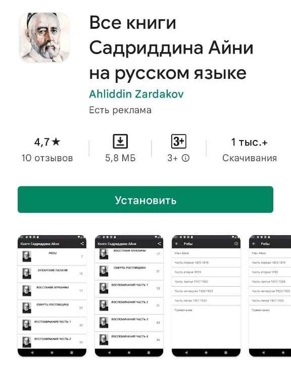 Аҳлиддин Зардаков, барномасози ҷавони тоҷик нармафзор (приложение)-е барои телефонҳои мобилӣ сохтааст, ки дар он тамоми осори Садриддин Айнӣ, сардафтари адабиёти муосири тоҷик ва Қаҳрамони Тоҷикистонро ба забони русӣо метавон дарёфт кард.