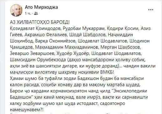 – Ё Бадахшон фақат барои Мамадшо Илолов, Ёдгор Файзов, Далер Ҷумъаев, Парвона Ҷамшедов, Зулфия Давлатзода, Ҷумъа Ҷумъаев, Ато Мирхоҷа, (лоақал Муҳаммади Султон, Алим Шерзамонов, Рустами Ҷонӣ, Анора Саркорова ва монанди инҳо, ки пайваста андешаҳои мухолифашонро ба мағзи мардум ҷой карда истодаанд) лозим асту халос?!,- пурсидааст Ато Мирхоҷа.