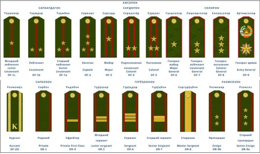 «Ефрейтор – радабон, младший сержант – даставар, сержант – дастаёр, старший сержант – дастабон, старшина – сардаста, прапорщик – силаҳбон, лейтенант – таҳамдор, капитан – таҳамтан, майор – саргурд, подполковник – сарҳангёр, полковник – сарҳанг, генерал – солор, генерал-майор – гундсолор, генерал-лейтенант – лашкарсолор, генерал-полковник – сипаҳсолор ва генерал армии – артишсолор».