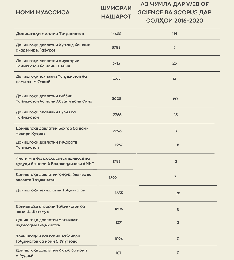 Як мурур ба сомонаи Китобхонаи илмии электронии Русия – Elibrary.ru (https://www.elibrary.ru/) нишон медиҳад, ки аз Тоҷикистон 76 муассисаи илмию тадқиқотӣ ва илмию таҳсилотӣ номнавис шудаанд. Ба бонуфузтарин муассисаҳои ватанӣ, ки кормандони онҳо мақолаҳои бештар (беш аз ҳазор) дар ин сомона доранд, ворид мешаванд: