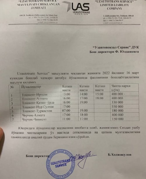 Ба таври расмӣ дар бораи нархи роҳкирои автобусҳое, ки аз Ӯзбекистон ба Қазоқистон меравад, мақомоти Ӯзбекистон хабар надодаанд, вале чанд рӯз аст, ки дар шабакаҳои иҷтимоии Ӯзбекистон ҷадвали автобусҳо ва нархҳои он мечархад.