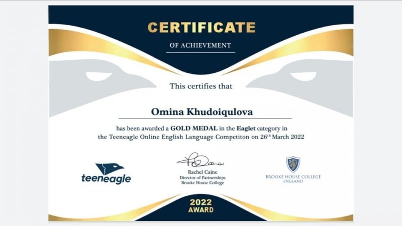 Омина Худойқулова як мактабхони 14-сола аз ноҳияи Восеъ дар Олимпиадаи байналмилалии Teeneagle ONLINE аз фанни забони англисӣ сазовори ҷойи аввал ва медали тилло гшудааст.