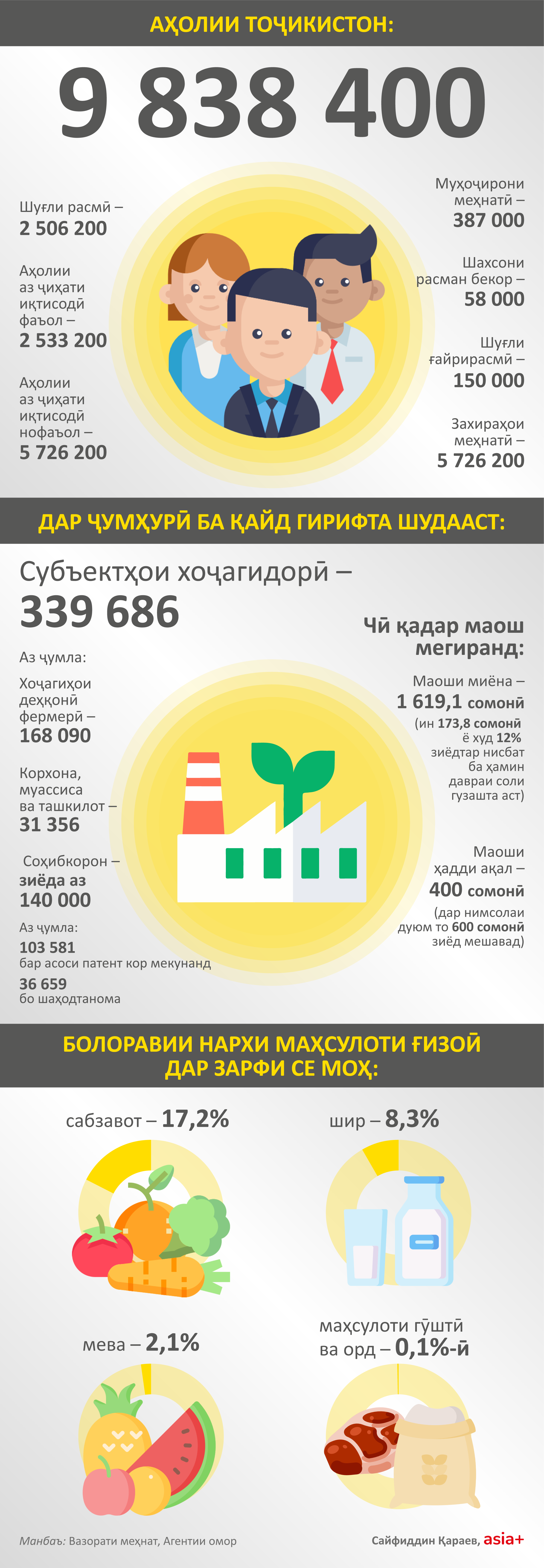 Дар омор шумори аҳолӣ, шахсони бо кор таъмину бекорон ва нишондиҳандаҳои маош зикр шудааст.