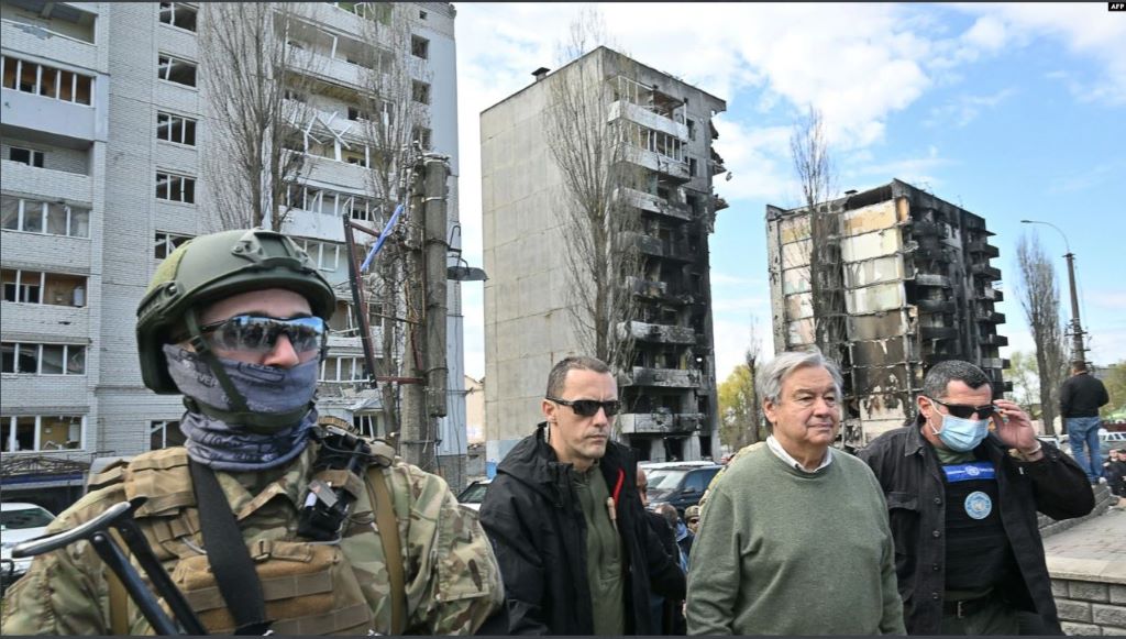 Гутерреш рӯзи 27-уми апрел, баъди мулоқот бо раисҷумҳури Русия, ба Киев рафт. Вай пеш аз мулоқот бо Владимир Зеленский, раисҷумҳури Укроин, дар Твиттер навишт: "Мо ба расондани ёриҳои башардӯстона ва берун овардани ғайринизомиён аз минтақаҳои даргирӣ идома хоҳем дод".