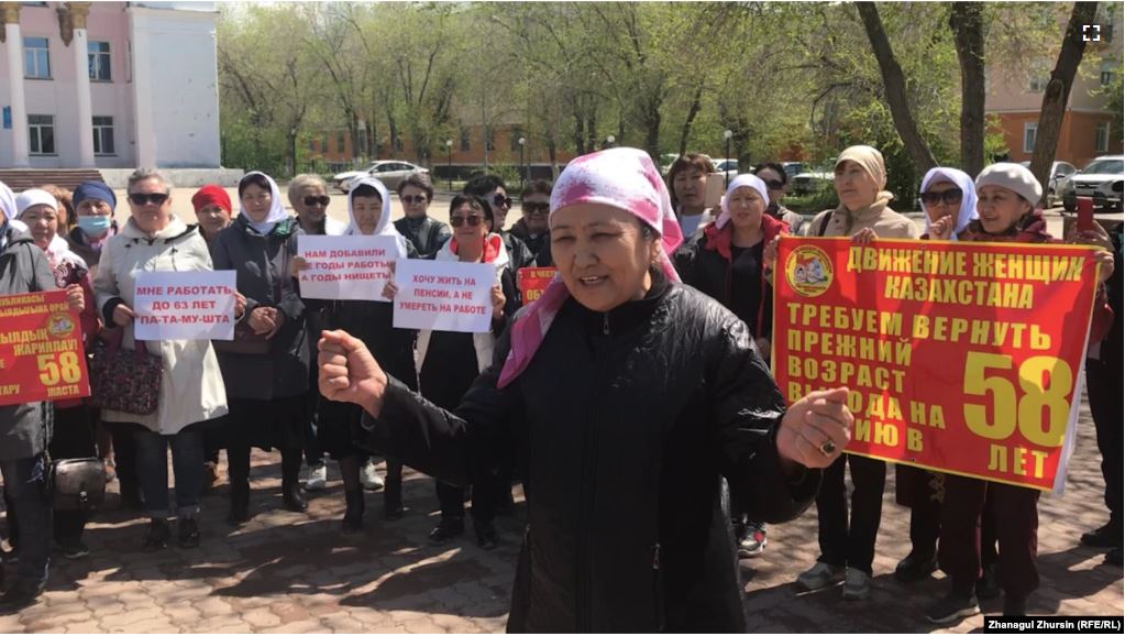 Сокинони Қазоқистон рӯзи 14 май якбора дар чаҳор шаҳри он кишвар – Нурсултон, Алмато, Оқтеппа ва Костанай бо талаби поин бурдани синни нафақа барои занон тазоҳурот карданд.
