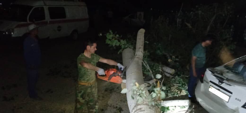 Аз ҷумла 19 май соати 20:36 дақиқаи вақти маҳаллӣ дар наздикии бинои ҳукумати ноҳияи Фирдавсии пойтахт дар кӯчаи ба номи Неъмат Қарабоев, бар асари боди шадид як дарахти азим болои мошини тамғаи “Ниссан” чаппа шуд.