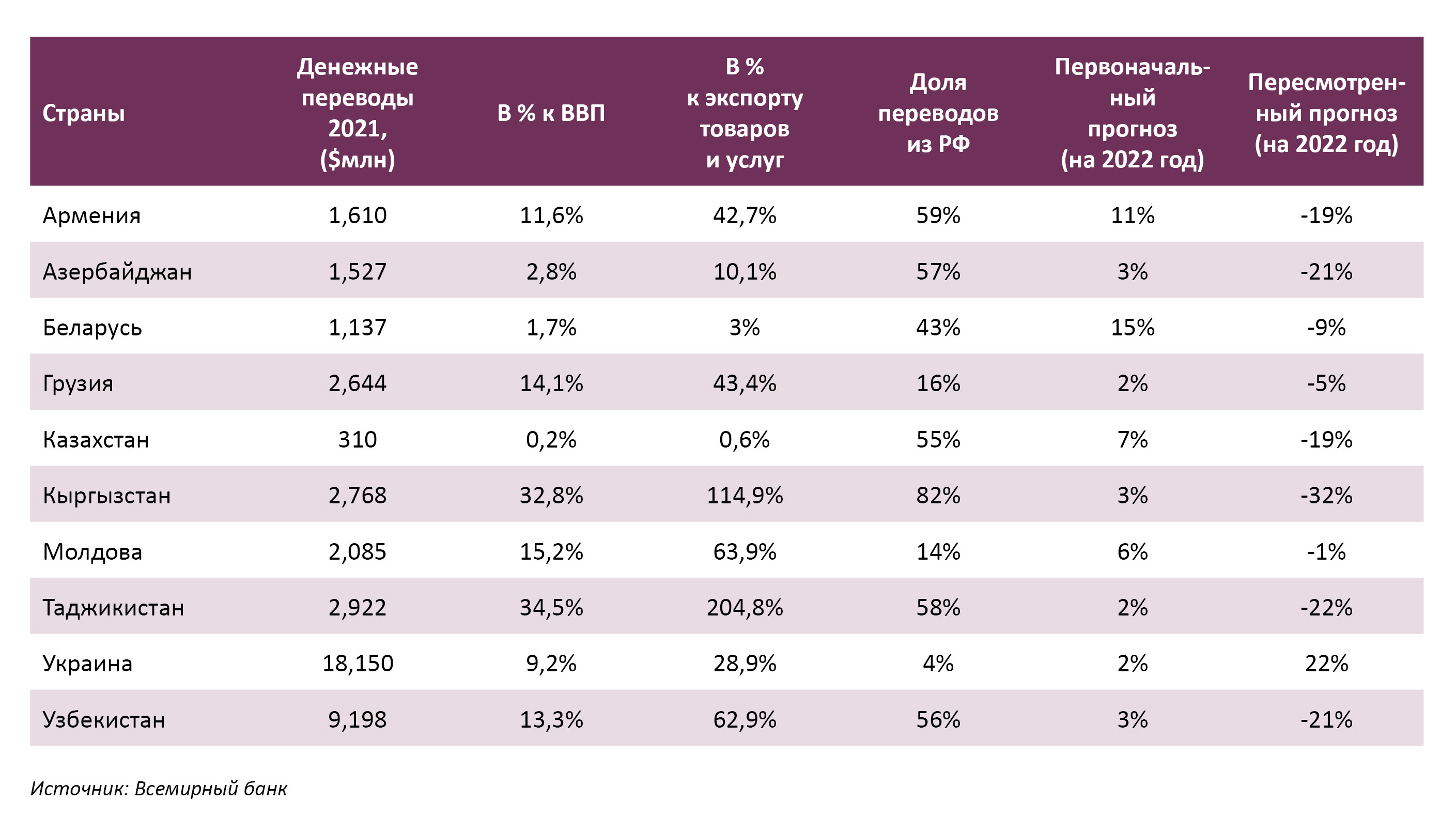 Ҷолиб аст, ки ҳиссаи интиқоли пул аз Русия тайи солҳои ахир ба таври назаррас коҳиш ёфта, дар соли 2021 ҳамагӣ 58%-ро ташкил дод ва ин ҳам дар ҳолест, ки то нимаи солҳои баъди 2010-ум ҳиссаи вуруди пул аз Русия дар ҳаҷми умумии чунин интиқолҳо беш аз 90%-ро ташкил медод.
