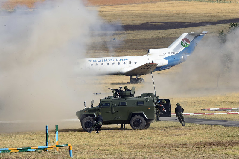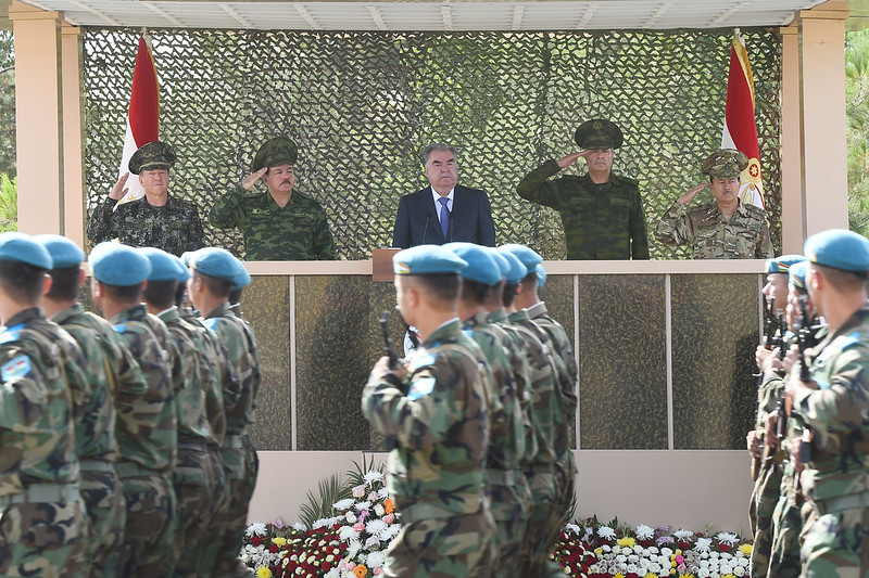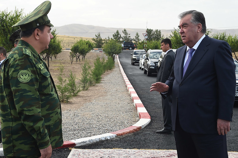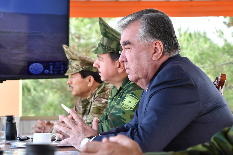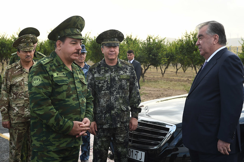 Сипас Эмомалӣ Раҳмон ба маркази баргузории чорабинӣ, ки машқҳои махсуси тактикӣ ва гузашти низомӣ пешбинӣ гардида буд, ташриф овард.
