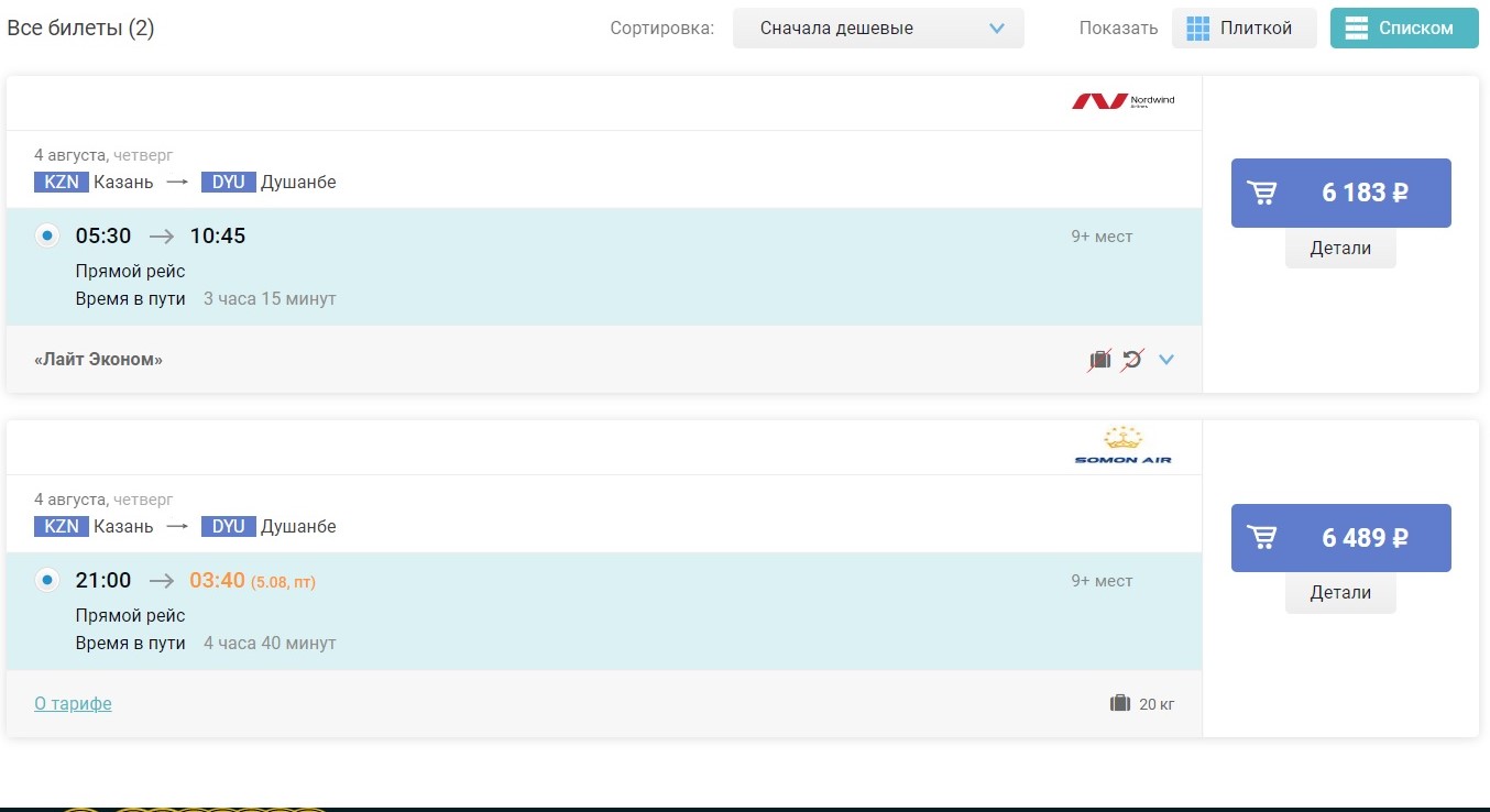 Барои рӯзи 4 август нархи билети хатсайри ширкати Somon Air аз Қазон 6 ҳазору 489 рубл (тақрибан 108 доллар) зикр шудааст.