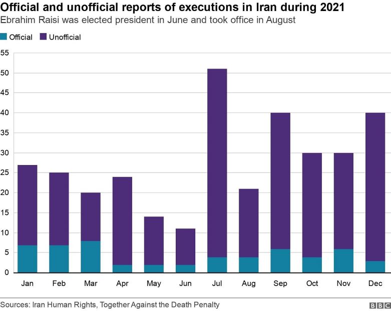 Дар ин бора BBC иттилоъ дода, таъкид намудааст, ки мақомоти Эрон “истифодаи ҳукми қатлро ба таври қобили мулоҳиза афзоиш дода, дар соли ҷорӣ назар ба соли гузашта ду маротиба бештар одамонро эъдом кардаанд”.