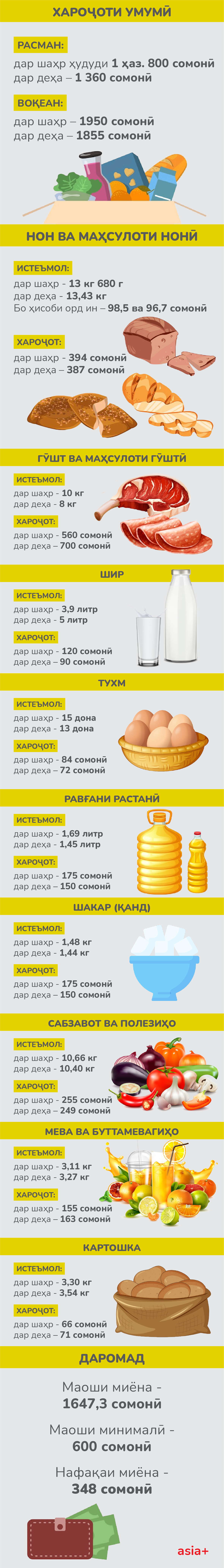 Мо хароҷоти танҳо маҳсулоти асосии хӯроквориро ҳисоб кардем, истеъмол бо назардошти як нафар ва хароҷот ба оилаи иборат аз 4 кас нишон дода шудааст.
