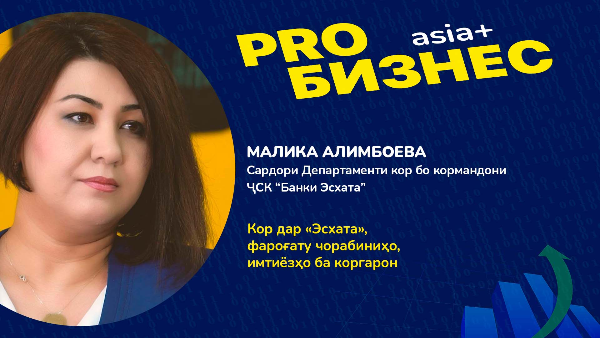 ҶСК “Бонки Эсхата” – бонки бузурги низомсоз буда, тими калоне он ҷо кор мекунад, ва кор бо ҳамаи онҳо, рушди ин тим – пурра бар дӯши як бонуи латиф аст. Чӣ гуна ӯ аз ӯҳдаи ин кор мебарояд? Фарқ миёни HR ва “Шуъбаи кадр”, ки дар бисёре аз корхонаҳои мо фаъоланд – дар чист? Ғайр аз маош, коргарон боз аз чизҳо бархурдоранд? Чӣ гуна метавон ҳам дар кор муваффақ шуду ва ҳам дар оиладорӣ? Ин ва дигар саволҳоро бо Малика Алимбоева матраҳ кардем, ки дар мусоҳибаи мо метавонед бубинед!