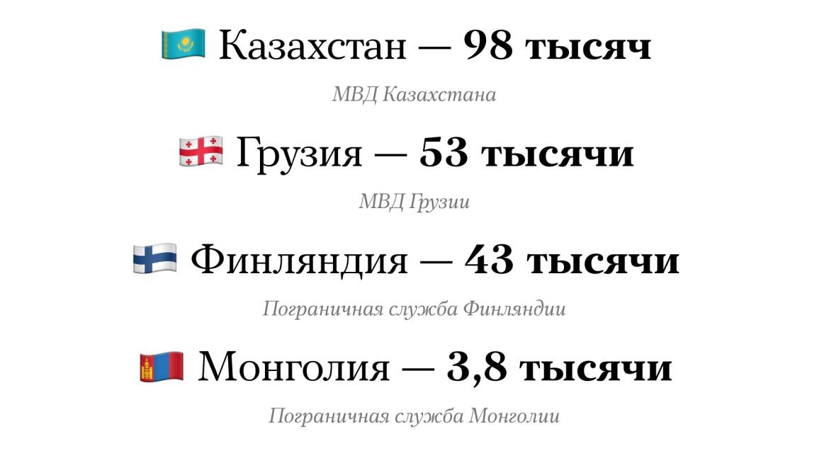 Дар ҳамин ҳол, нашрияи “Медуза” дар бораи шумори шаҳрвнадони Русия, ки айни замон ба кишварҳои ҳамсоя рафтааанд, маълумот медиҳад.