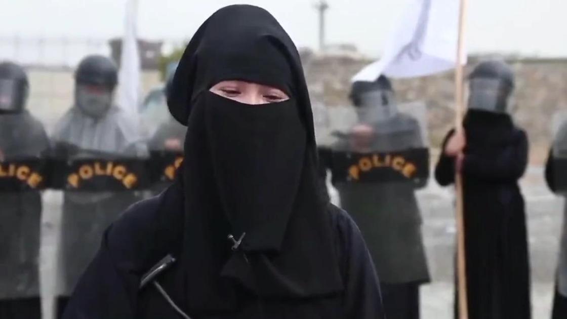 Дар як навори видеоие, ки РИА Новости дастрас кардааст, занон бо сипар ва кулоҳ муҷаҳҳаз шудаанд, ки пулис онҳоро маъмулан ҳангоми пароканда кардани тазоҳурот истифода мекунад.