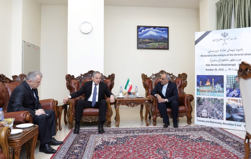 Имрӯз, 10-уми ноябр, Сироҷиддин Муҳриддин, вазири корҳои хориҷии Тоҷикистон бо ҳузур дар Сафорати Эрон дар шаҳри Душанбе, аз номи Ҳукумати Тоҷикистон ба давлат ва мардуми Эрон дар иртибот ба фоҷеаи ҳамлаи террористии чанд рӯз қабл ба ҳарами Шоҳчароғ дар шаҳри Шероз ибрози таслият намуд, хабар медиҳад ВКХ ҶТ.