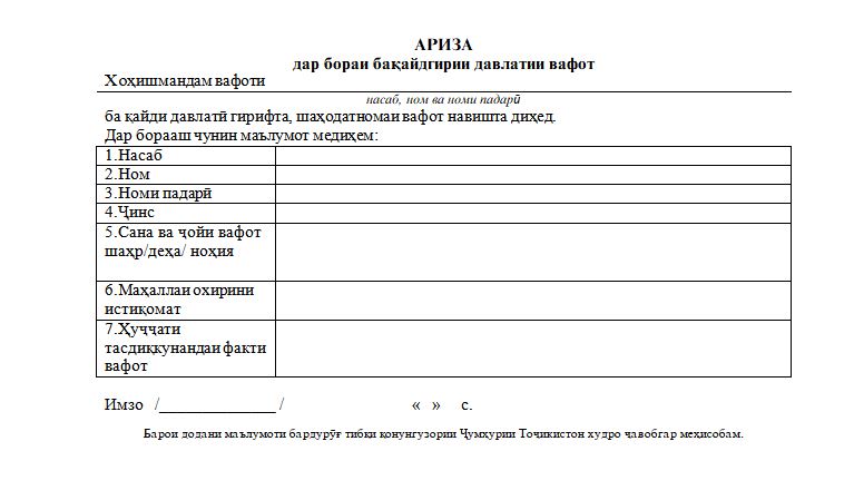 Шаҳодатномаи вафот дар се рӯз баъди додани ариза ва ройгон дода мешавад.