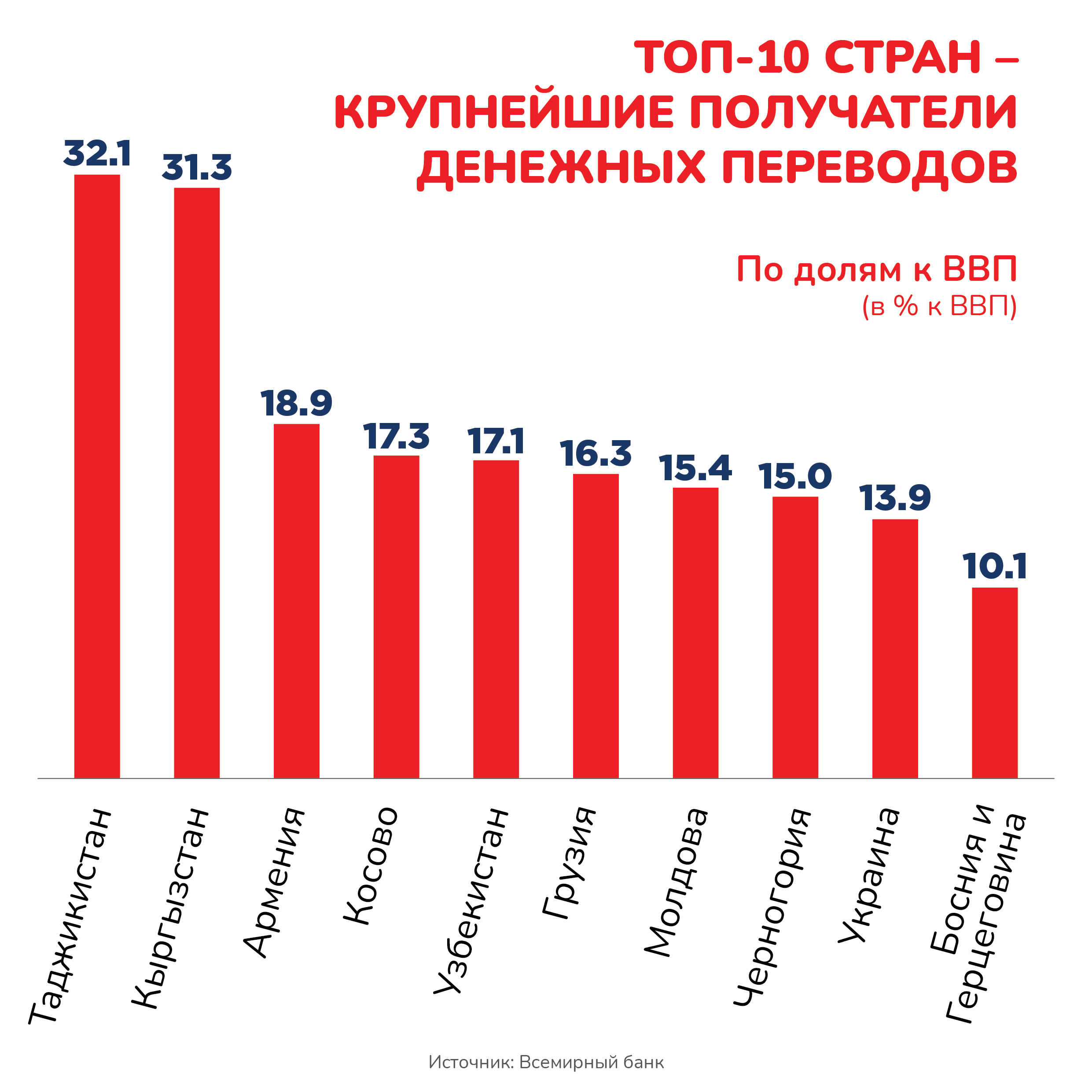 Дар гузориш зикр мешавад, ки дар таносуби фоизии интиқоли маблағ нисбат ба Маҷмӯи маҳсулоти дохилӣ (ММД) Тоҷикистон – 32% ва Қирғизистон – 31% пешсафанд.