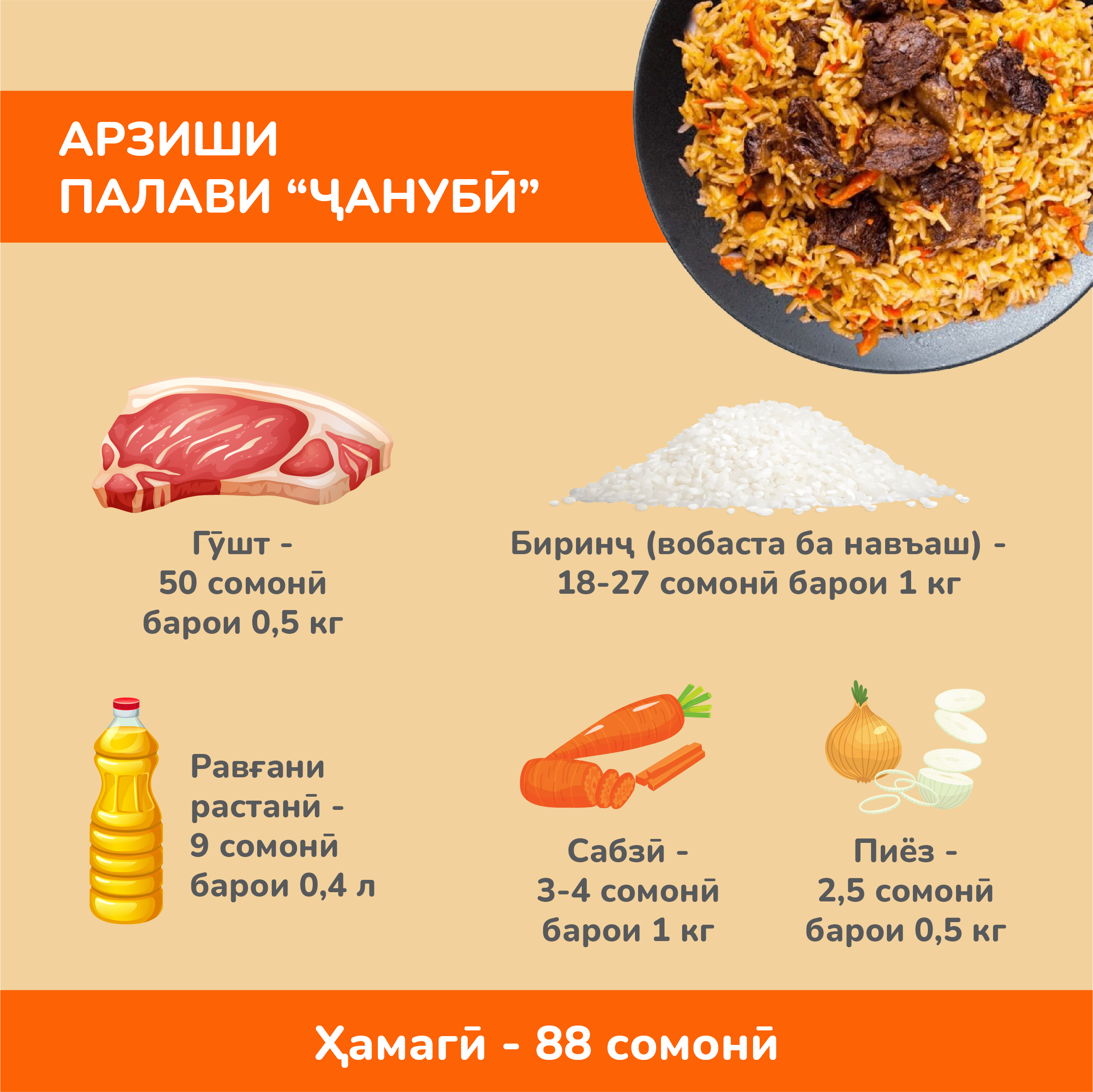Хароҷот барои пухтани зеби дастурхони тоҷикон – оши палавро барои 1 оилаи иборат аз 5 нафар ва вобаста ба минтақа ҳисоб кардем.