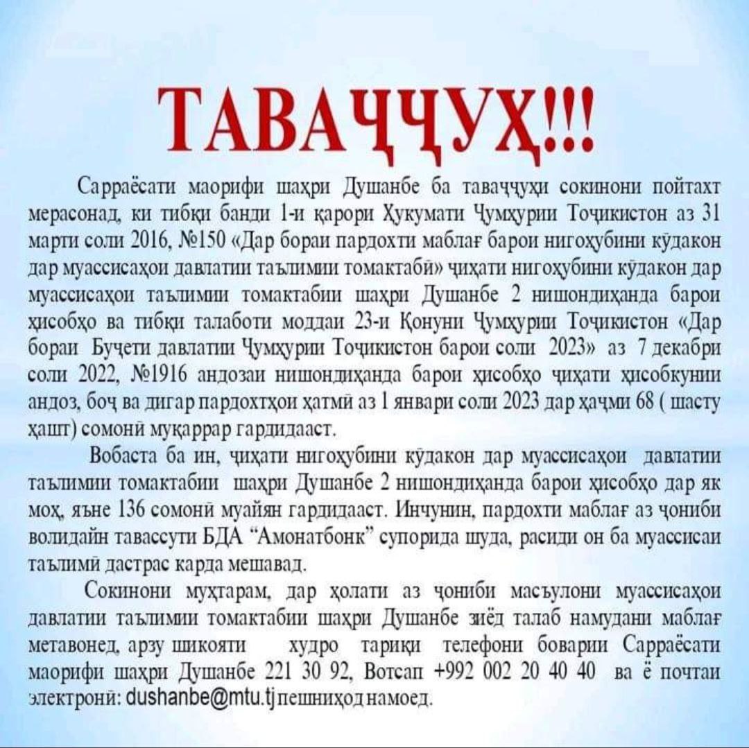 Ин аст, ки Сарраёсати маорифи шаҳри Душанбе аз сокинон хоҳиш намудааст, ки дар ҳолати аз ҷониби масъулони муассисаҳои таълимми пойтахт талаб намудани маблағи бештар, ба телефони боварии ин ниҳод 2213092 тамос бигиранд ва ба почтаи электронии [email protected] муроҷиат намоянд.