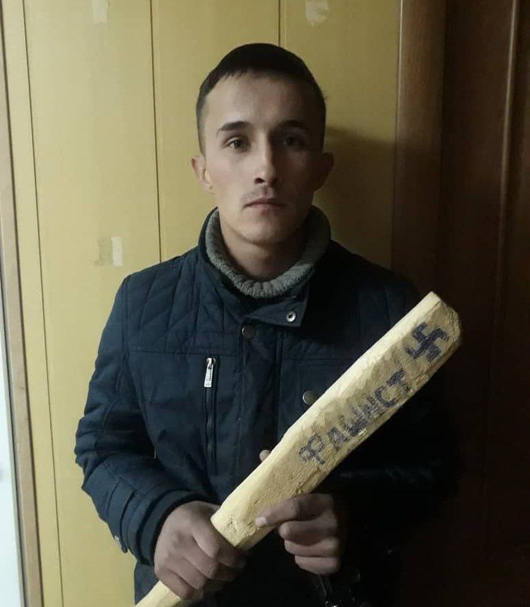 Дар аксе, ки РВКД-и пойтахт нашр кардааст, дида мешавад, ки дар дастчӯб “фашист” навишта шуда, рамзи он ҳам ҳаст. Ин чӣ маъно дорад ва чаро ӯ чунин навиштааст, маълум нест.