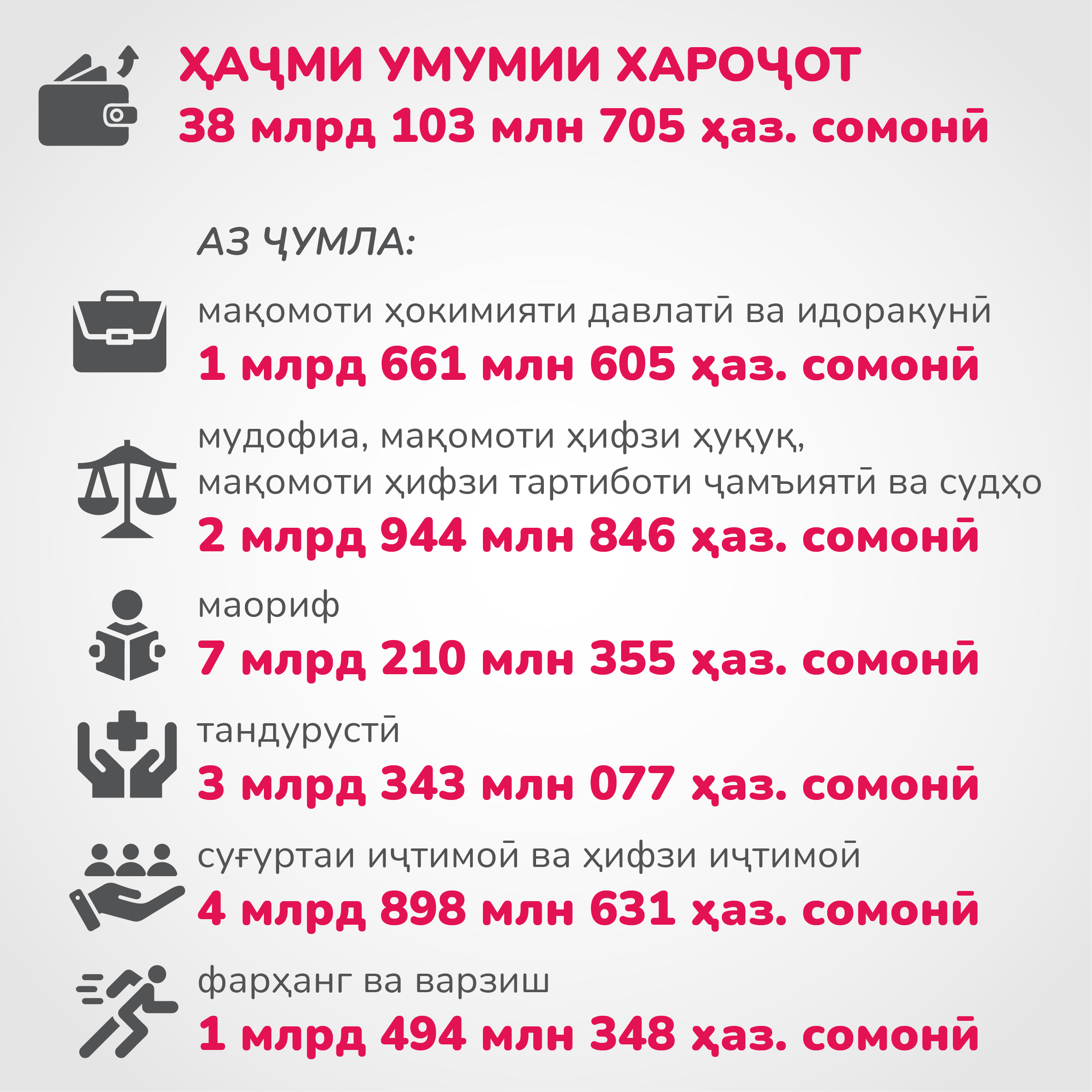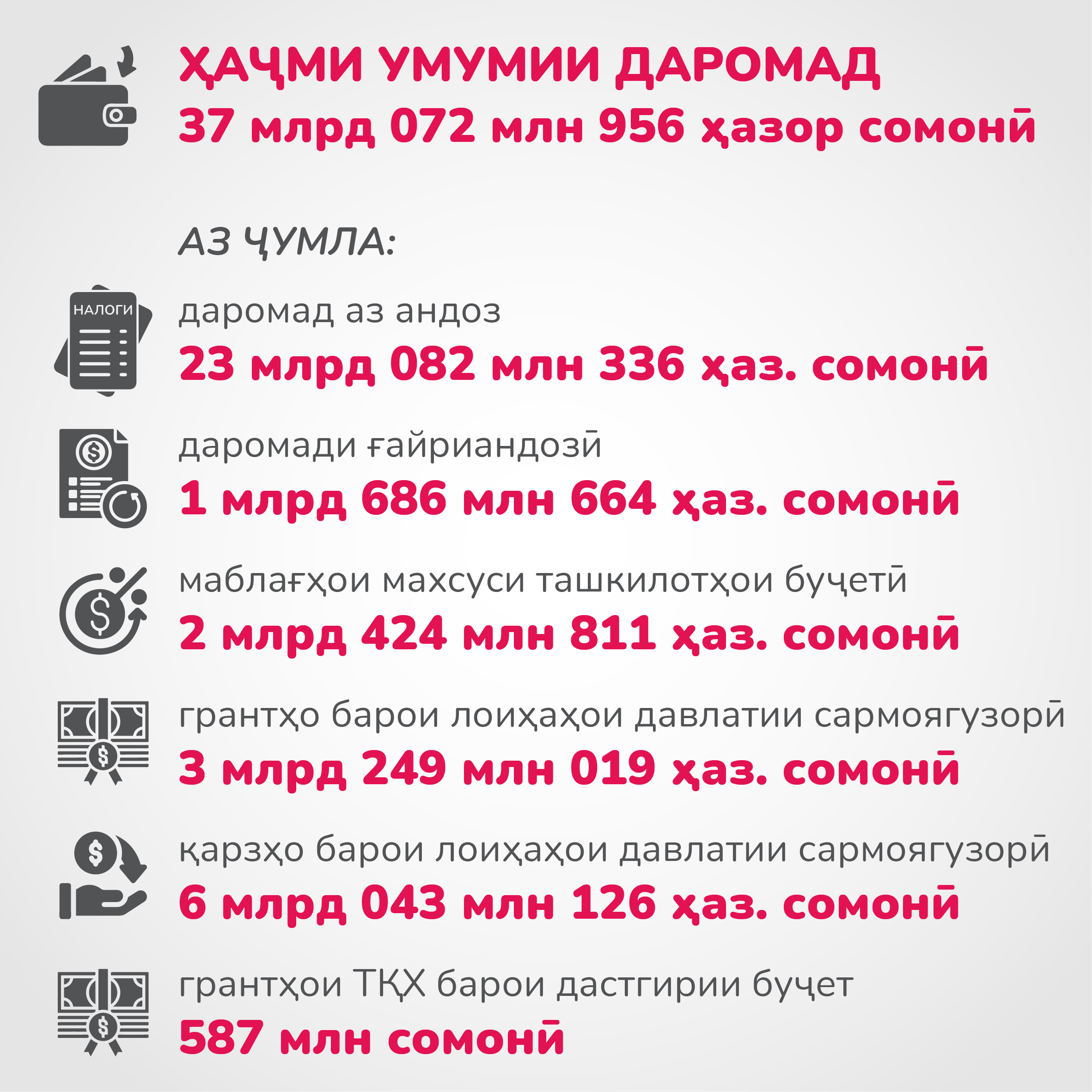 ИқтисодХабар Буҷаи Тоҷикистон – 2023: Кӣ аз ҳама бештар пул мегирад? 5353 Пайрав Чоршанбиев, Asia-Plus 18.01.2023 TelegramFacebookWhatsAppCopy URL Хароҷоти бештар ба соҳаи маориф, комплекси сӯзишворӣ ва энергетикӣ, инчунин бахши тандурустӣ пешбинӣ шудааст. Дар Telegram, Facebook, Instagram, OK ва ВК бо мо бимонед. Мавод ба ин забонҳо дастрас аст: Рус Тоҷ Previous articleВуруди сайёҳони хориҷӣ ба Тоҷикистон беш аз 3 баробар афзудNext articleДар пайи сардиҳо. Афзоиши сӯхтор ва фавти як нафар дар Суғд Маводҳои монанд Ҳусиҳои Яман бо партоби мушак ба Исроил расман вориди ҷанг бо ин кишвар шудаанд Дар маҷлиси навбатии ҳукумат омодагии кишвар ба мавсими тирамоҳу зимистони соли 2026-2027 баррасӣ шуд Боздид аз Оромгоҳи Исмоили Сомонӣ ва Қалъаи Бухоро. Эмомалӣ Раҳмон дар Бухоро кадом мавзеъҳоро зиёрат кард? Пурхонанда Шахси калидӣ барои музокирот ё ходими содиқи низом. Муҳаммадбоқир Қолибоф кист? Субҳ ба хайр, Тоҷикистон! Як рӯз дар таърих, зодрӯзи шахсиятҳо, вазъи ҳаво барои 29 марти соли 2026 Аз оғози кушторҳои пайдарпай дар Конибодом ду сол гузашт. Ангезаи кушторҳо чӣ буду гумонбарон чӣ ҷазо гирифтанд ва чанд кас кушта шуд? Ҳусиҳои Яман бо партоби мушак ба Исроил расман вориди ҷанг бо ин кишвар шудаанд Дар маҷлиси навбатии ҳукумат омодагии кишвар ба мавсими тирамоҳу зимистони соли 2026-2027 баррасӣ шуд Ба мо дар шабакаҳои иҷтимоӣ пайвандед! TelegramInstagramFacebookTiktokYoutube Реклама на asia + Ахбори тоза Шахси калидӣ барои музокирот ё ходими содиқи низом. Муҳаммадбоқир Қолибоф кист? admin - Номи Муҳаммадбоқир Қолибоф, раиси Маҷлиси Эрон ва фармондеҳи пешини Сипоҳи посдорони Инқилоби Исломӣ як ҳафтаи охир дар сархати расонаҳо қарор гирифтааст. Махсусан, баъди он... Субҳ ба хайр, Тоҷикистон! Як рӯз дар таърих, зодрӯзи шахсиятҳо, вазъи ҳаво барои 29 марти соли 2026 admin - Аз таъсиси Иттифоқи меъморони Тоҷикистон то ихтирои "Кока-кола". Аз оғози кушторҳои пайдарпай дар Конибодом ду сол гузашт. Ангезаи кушторҳо чӣ буду гумонбарон чӣ ҷазо гирифтанд ва чанд кас кушта шуд? admin - Ҳоло вазъ дар ин шаҳр чӣ гуна аст? Ҳусиҳои Яман бо партоби мушак ба Исроил расман вориди ҷанг бо ин кишвар шудаанд admin - Ин нахустин мушакии Ҳусиҳо ба Исроил аз замони оғози ҷанг алайҳи Эрон аст. Дар маҷлиси навбатии ҳукумат омодагии кишвар ба мавсими тирамоҳу зимистони соли 2026-2027 баррасӣ шуд admin - Дар маҷлиси навбатии ҳукумаи Тоҷикистон, ки имрӯз, 28-уми март... Аз ваъдаи суқути низом то илтиҷо барои бозгушоии Ҳурмуз. Аз оғози ҷанги Амрикову Исроил бо Эрон як моҳ гузашт admin - Дар ин муддат на Амрико ва на Исроил ба ҳадафи аслии худ – суқути низом дар Эрон нарасиданд ва ҳоло ба гирдоби мушкили дигар печидаанд. Субҳ ба хайр, Тоҷикистон! Як рӯз дар таърих, зодрӯзи шахсиятҳо, вазъи ҳаво барои 28 марти соли 2026 admin - Аз оғози кушторҳои пайдарпай дар Конибодом то мавлуди Нақибхон Туғралу Далер Ҷумъа ва Рӯзи ҷаҳонии муаррихон. Боздид аз Оромгоҳи Исмоили Сомонӣ ва Қалъаи Бухоро. Эмомалӣ Раҳмон дар Бухоро кадом мавзеъҳоро зиёрат кард? admin - Рӯзи дуюми сафари Эмомалӣ Раҳмон ба Ӯзбекистон чӣ гуна гузашт? “Фалсафаи инсонмеҳварӣ ва васли инсонҳо”. Чӣ гуна Наврӯз ҷашни ваҳдати миллатҳо гардид? admin - Ҳарчанд, русуму ойинҳои ҳама миллатҳо аз ҳам тафовут доранд ва шеваи ҷашнороӣ низ фарқ мекунад, вале паёми Наврӯз барои ҳама яксон мемонад - расидан ба рӯзи нав, муттаҳидӣ ва оғози фасли тозаи зиндагӣ. Эмомалӣ Раҳмон ба Суғд меравад. Кадом роҳҳои мошингарди вилоят се рӯз баста мешаванд? admin - Эмом