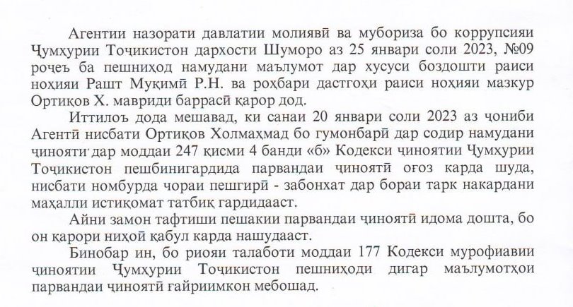 Холмаҳмад Ортиқов, роҳбари дастгоҳи ҳукумати ноҳияи Рашт бо гумони қаллобӣ ба миқдори махсусан калон боздошт ва нисбаташ парвандаи ҷиноятӣ боз шуда, чора дар шакли “забонхат дар бораи тарк накардани маҳҳали истиқоматаш” татбиқ шудааст.