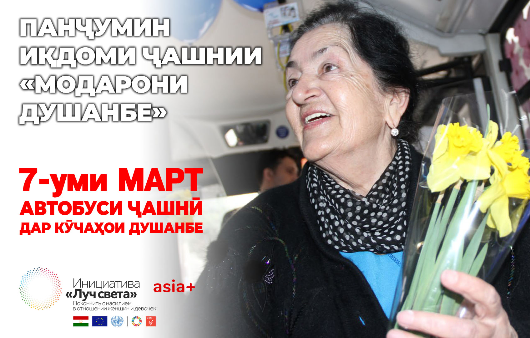 Рӯзи 7-уми март автобуси идона дар хиёбон Рӯдакии пойтахт ҳаракат карда, ба бонувони зебои кишвар ройгон хидмат мекунад. Онҳоро гулу тӯҳфаҳои гуворо, мусиқӣ ва ҳадяҳои ғайриинтизор аз “Азия-Плюс” интизор аст.