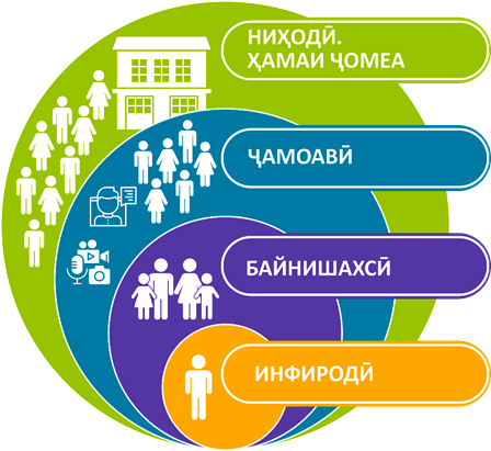 Стратегияи коммуникатсионӣ ба 4 сатҳи модели иҷтимоиву муҳитзистӣ такя мекунад: